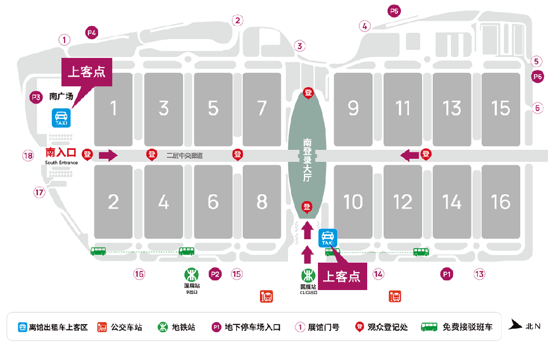 如您要到南登錄大廳,請導航至國展地鐵站C口;